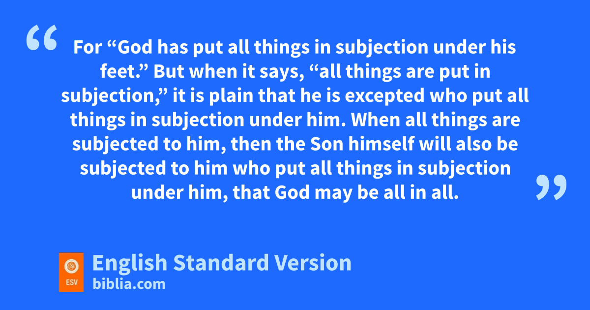 20 But in fact fChrist has been raised from the dead, gthe firstfruits of those who have fallen asleep. 21 For as hby a man came death, iby a man has come also the resurrection of the dead. 22 For jas in Adam all die, so also in Christ shall all be made alive. 23 But each in his own order: Christ the firstfruits, then kat his coming lthose who belong to Christ. 24 Then comes the end, when he delivers mthe kingdom to God the Father after destroying nevery rule and every authority and power. 25 For he must reign ountil he has put all his enemies under his feet. 26 The last enemy to be pdestroyed is death. 27 For q“God3 has put all things in subjection under his feet.” But when it says, “all things are put in subjection,” it is plain that he is excepted who put all things in subjection under him. 28 When rall things are subjected to him, then the Son himself will also be subjected to him who put all things in subjection under him, that sGod may be all in all.