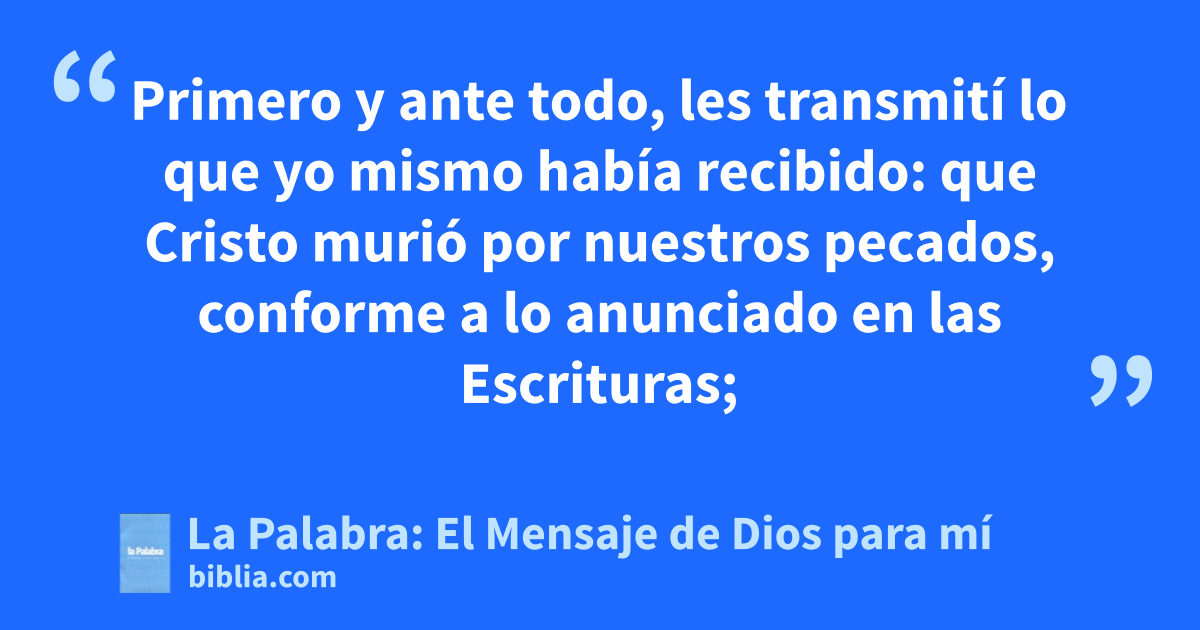 3 Primero y ante todo, les transmití lo que yo mismo había recibido: que Cristo murió por nuestros pecados, conforme a lo anunciado en las Escrituras; 4 que fue sepultado y que resucitó al tercer día, conforme a esas mismas Escrituras; 5 que se apareció primero a Pedro y, más tarde, a los Doce. 6 Después se apareció a más de quinientos hermanos juntos, de los cuales algunos han muerto, pero la mayor parte vive todavía. 7 Se apareció después a Santiago, y de nuevo a todos los apóstoles. 8 Finalmente, como si se tratara de un hijo nacido fuera de tiempo, se me apareció también a mí, 9 que soy el más pequeño entre los apóstoles y que no merezco el nombre de apóstol, por cuanto perseguí a la Iglesia de Dios. 10 Pero la gracia divina ha hecho de mí esto que soy; una gracia que no se ha malogrado en cuanto a mí toca. Al contrario, me he afanado más que todos los otros; bueno, no yo, sino la gracia de Dios que actúa en mí. 11 De cualquier modo, sea yo, sean los demás, esto es lo que anunciamos y lo que ustedes han creído.