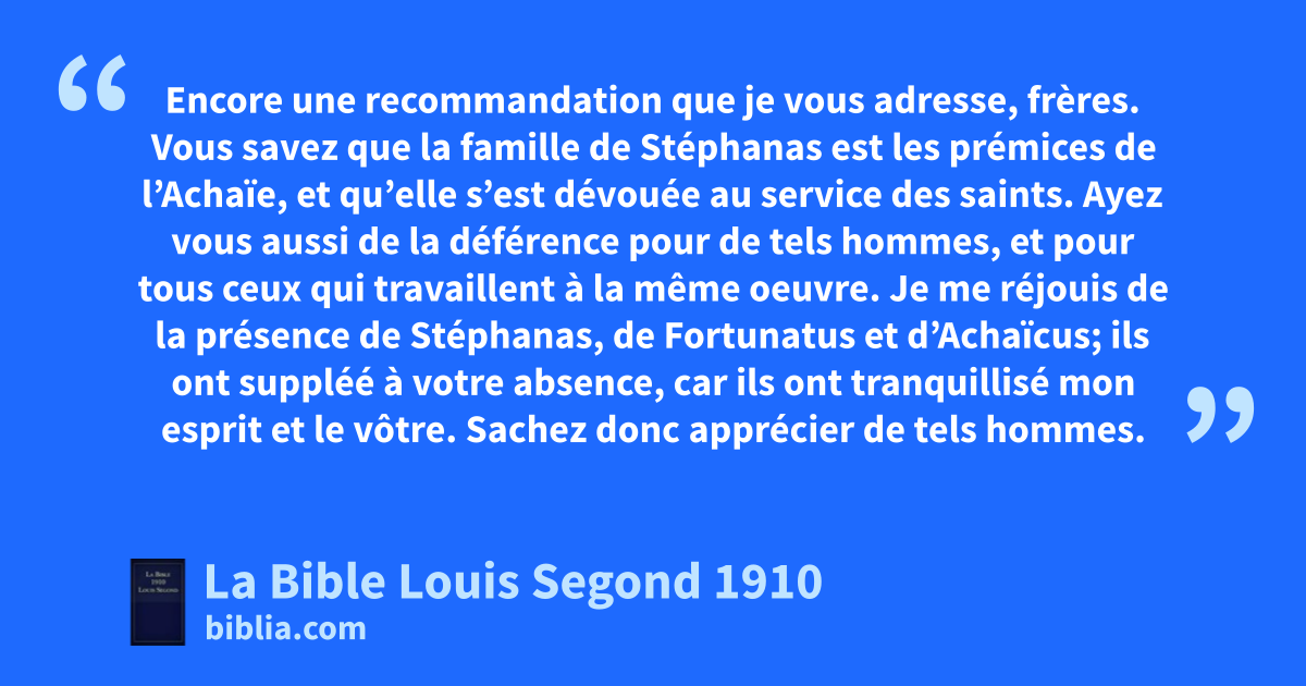 13Veillez, demeurez fermes dans la foi, soyez des hommes, fortifiez-vous. 14Que tout ce que vous faites se fasse avec charité! 15Encore une recommandation que je vous adresse, frères. Vous savez que la famille de Stéphanas est les prémices de l’Achaïe, et qu’elle s’est dévouée au service des saints. 16Ayez vous aussi de la déférence pour de tels hommes, et pour tous ceux qui travaillent à la même oeuvre. 17Je me réjouis de la présence de Stéphanas, de Fortunatus et d’Achaïcus; ils ont suppléé à votre absence, 18car ils ont tranquillisé mon esprit et le vôtre. Sachez donc apprécier de tels hommes.