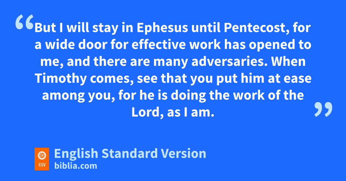 5 jI will visit you after passing through kMacedonia, for lI intend to pass through Macedonia, 6 and perhaps I will stay with you or even spend the winter, so that you may mhelp me on my journey, wherever I go. 7 For I do not want to see you now njust in passing. I hope to spend some time with you, oif the Lord permits. 8 But I will stay in Ephesus until pPentecost, 9 for qa wide door for effective work has opened to me, and rthere are many adversaries.