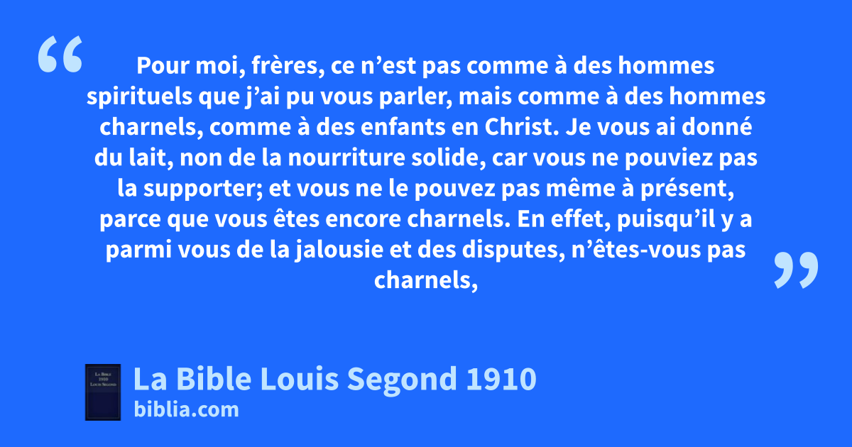 1Pour moi, frères, ce n’est pas comme à des hommes spirituels que j’ai pu vous parler, mais comme à des hommes charnels, comme à des enfants en Christ. 2aJe vous ai donné du lait, non de la nourriture solide, car vous ne pouviez pas la supporter; et vous ne le pouvez pas même à présent, parce que vous êtes encore charnels. 3bEn effet, puisqu’il y a parmi vous de la jalousie et des disputes, n’êtes-vous pas charnels, et ne marchez-vous pas selon l’homme? 4Quand l’un dit: cMoi, je suis de Paul! et un autre: Moi, d’Apollos! n’êtes-vous pas des hommes? 5Qu’est-ce donc dqu’Apollos, et qu’est-ce que Paul? Des serviteurs, par le moyen desquels vous avez cru, selon que le Seigneur l’a donné à chacun. 6J’ai planté, eApollos a arrosé, mais Dieu a fait croître, 7en sorte que ce n’est pas celui qui plante qui est quelque chose, ni celui qui arrose, mais Dieu qui fait croître. 8Celui qui plante et celui qui arrose sont égaux, fet chacun recevra sa propre récompense selon son propre travail. 9Car nous sommes gouvriers avec Dieu. Vous êtes le champ de Dieu, hl’édifice de Dieu.