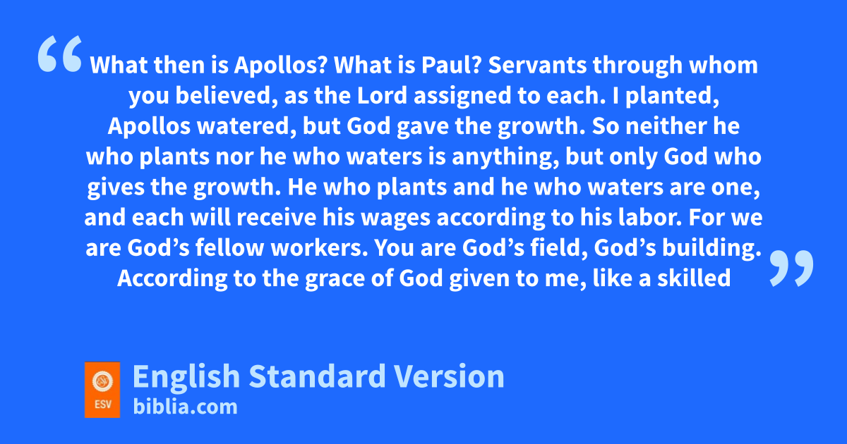 5 What then is Apollos? What is Paul? iServants through whom you believed, jas the Lord assigned to each. 6 kI planted, lApollos watered, mbut God gave the growth. 7 So nneither he who plants nor he who waters is anything, but only God who gives the growth. 8 He who plants and he who waters are one, and each owill receive his wages according to his labor. 9 For we are pGod’s fellow workers. You are God’s field, qGod’s building.