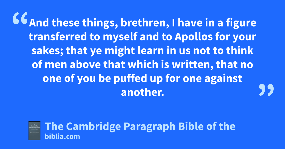 6 And these things, brethren, mI have nin a figure transferred to myself and to Apollos for your sakes; that ye might learn in us onot to think of men above that which is written, pthat no one of you qbe puffed up for one against another. 7 For who * rmaketh thee to differ from another? and swhat hast thou that thou didst not treceive? now if thou didst receive it, why dost thou glory, as if thou hadst not received it? 8 Now ye are full, unow ye are rich, ye have reigned as kings without us: and xI would to God ye did reign, that we also might reign with you. 9 For yI think that God hath set forth * us the apostles last, zas it were appointed to death: for awe are made a * spectacle unto the world, and to angels, and to men. 10 bWe are fools for Christ’s sake, but bbye are wise in Christ; cwe are weak, but ye are strong; ye are honourable, but we are despised. 11 Even unto this present hour we both dhunger, and dthirst, and deare naked, and fare buffeted, and have no certain dwelling place; 12 and glabour, working with our own hands: hbeing reviled, we bless; ibeing persecuted, we suffer it: 13 being defamed, we intreat: we are made jas the filth of the world, and are kthe offscouring of all things unto this day. 14 I write not these things to lshame you, but mas my beloved sons I warn you. 15 For though you have ten thousand ninstructors in Christ, yet have ye not many fathers: for oin Christ Jesus I have begotten you through the gospel. 16 Wherefore I beseech you, pbe ye followers of me. 17 For this cause have I sent unto you qTimotheus, rwho is my beloved son, and sfaithful in the Lord, who shall tbring you into remembrance of my ways which be in Christ, uas I teach every where in every church. 18 Now xsome are ypuffed up, as though I would not come to you. 19 zBut I will come to you shortly, aif the Lord will, and will know, not the speech of them which are ypuffed up, but the power. 20 For the kingdom of God is not in word, but bin power. 21 What will ye? cshall I come unto you dwith a rod, or in love, and in ethe spirit of meekness?