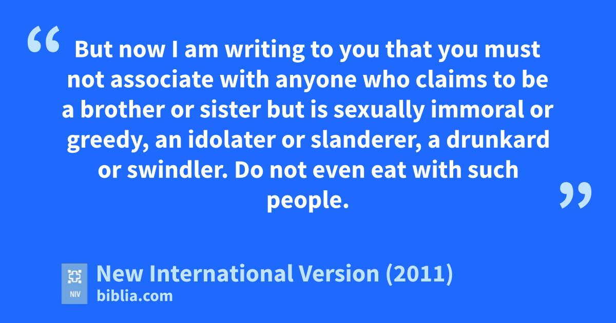 9 I wrote to you in my letter not to associatey with sexually immoral people—10 not at all meaning the people of this worldz who are immoral, or the greedy and swindlers, or idolaters. In that case you would have to leave this world. 11 But now I am writing to you that you must not associate with anyone who claims to be a brother or sisterc a but is sexually immoral or greedy, an idolaterb or slanderer, a drunkard or swindler. Do not even eat with such people.c