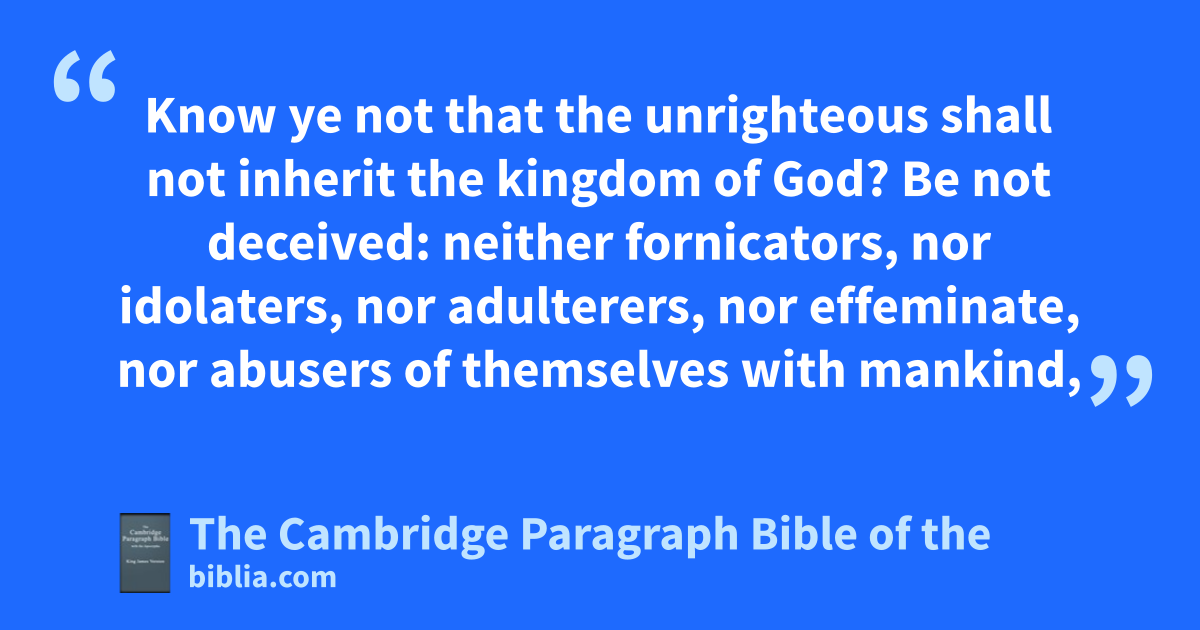 VI. Dare any of you, having a matter against another, go to law before the unjust, and anot before the saints? 2 Do ye not know that bthe saints shall judge the world? and if the world shall be judged by you, are ye unworthy to judge the smallest matters? 3 Know ye not that we shall cjudge angels? how much more things dthat pertain to this life? 4 If then ye have judgments of things dpertaining to this life, set them to judge who are least esteemed in the church. 5 eI speak to your shame. Is it so, that there is not a wise man amongst you? no, not one that shall be able to fjudge between his brethren? 6 But brother goeth to law with brother, and that before the unbelievers. 7 Now therefore there is gutterly a hfault among you, because ye go to law one with another. iWhy do ye not rather take wrong? why do ye not rather suffer yourselves to be defrauded? 8 Nay, you do wrong, jand defraud, and that your brethren. 9 Know ye not that the unrighteous kshall not inherit the kingdom of God? lBe not deceived: kneither mnofornicators, nor oidolaters, nor nadulterers, nor effeminate, nor mpabusers of themselves with mankind, 10 knor thieves, nor covetous, nor drunkards, nor revilers, nor extortioners, shall inherit the kingdom of God. 11 And such were qsome of you: but rye are washed, but sye are sanctified, but tye are justified uin the name of the Lord Jesus, and by the Spirit of our God.