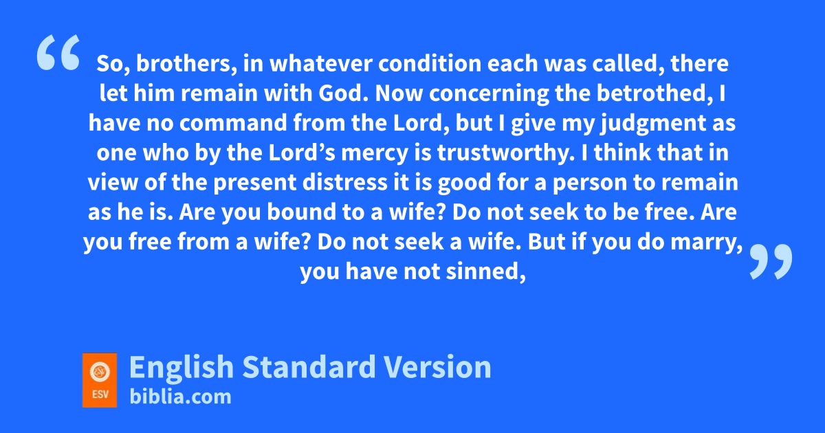 25 Now concerning7 the betrothed,8 xI have no command from the Lord, but I give my judgment as yone who by the Lord’s mercy is ztrustworthy. 26 I think that in view of the present9 distress ait is good for a person to remain as he is. 27 Are you bound to a wife? Do not seek to be free. Are you free from a wife? Do not seek a wife. 28 But if you do marry, you have not sinned, and if a betrothed woman10 marries, she has not sinned. Yet those who marry will have worldly troubles, and I would spare you that. 29 This is what I mean, brothers: bthe appointed time has grown very short. From now on, let those who have wives live as though they had none, 30 and those who mourn as though they were not mourning, and those who rejoice as though they were not rejoicing, and those who buy cas though they had no goods, 31 and those who deal with the world as though they had no dealings with it. For dthe present form of this world is passing away.