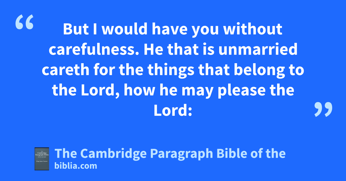 25 Now concerning virgins pI have no commandment of the Lord: yet I give pmy judgment, as qone that hath obtained mercy of the Lord to be rfaithful. 26 I suppose therefore that this is good for the spresent * tdistress, I say, uthat it is good for a man so to be. 27 Art thou bound unto a wife? seek not to be loosed. Art thou loosed from a wife? seek not a wife. 28 vBut and if thou marry, thou hast not sinned; and if a virgin marry, she hath not sinned. Nevertheless such wshall have trouble in the flesh: but xI spare you. 29 But this I say, brethren, ythe time is short: zit remaineth, that both they that have wives be as though they had none; 30 zand they that weep, as though they wept not; and they that rejoice, as though they rejoiced not; and they that buy, as though they apossessed not; 31 and they that use this world, as not babusing it: for cthe dfashion of this world passeth away. 32 But eI would have you without carefulness. fHe that is unmarried careth for the things * that belong to the Lord, how he may gplease the Lord: 33 but he that is married careth for the things that are of the world, how he may please his wife. 34 hThere is difference also between a wife and a virgin. The unmarried woman ecareth for the things of the Lord, that she may be holy both in body and in spirit: but she that is married careth for the things of the world, how she may please her husband. 35 And this I speak for your own profit; not that I may icast a snare upon you, but for that which is comely, and that you may attend upon the Lord without distraction. 36 But if any man think that he jbehaveth himself uncomely toward his virgin, if she kpass the flower of her age, and need so require, let him do what he will, he sinneth not: let them marry. 37 Nevertheless he that lstandeth mstedfast in his heart, having no necessity, but hath power over his own will, and hath so decreed in his heart that he will keep his virgin, doeth well. 38 So then he that giveth her in marriage ndoeth well; but he that giveth her not in marriage doeth better.