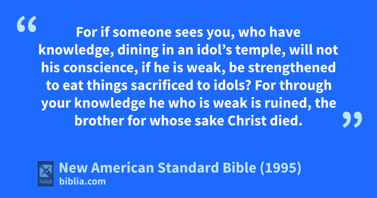 10 For if someone sees you, who have aknowledge, dining in an idol’s temple, will not his conscience, if he is weak, be strengthened to eat bthings sacrificed to idols?
