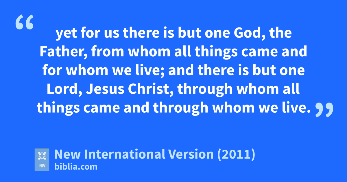 4 So then, about eating food sacrificed to idols:f We know that “An idol is nothing at all in the world”g and that “There is no God but one.”h 5 For even if there are so-called gods,i whether in heaven or on earth (as indeed there are many “gods” and many “lords”), 6 yet for us there is but one God,j the Father,k from whom all things camel and for whom we live; and there is but one Lord,m Jesus Christ, through whom all things camen and through whom we live.