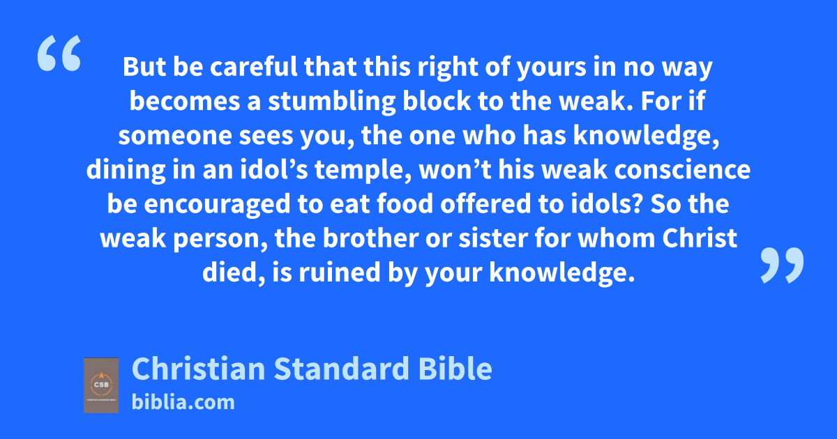 7 However, not everyone has this knowledge. Some have been so used to idolatry up until now that when they eat food sacrificed to an idol, their conscience, being weak, is defiled. 8 Food will not bring us close to God.D We are not worse off if we don’t eat, and we are not better if we do eat.l 9 But be careful that this right of yours in no way becomes a stumbling blockm to the weak. 10 For if someone sees you, the one who has knowledge, dining in an idol’s temple, won’t his weak conscience be encouragedE to eat food offered to idols? 11 So the weak person, the brother or sister for whom Christ died,n is ruinedA,o by your knowledge.p 12 Now when you sin like this against brothers and sisters and wound their weak conscience, you are sinning against Christ. 13 Therefore, if food causes my brother or sister to fall, I will never again eat meat,q so that I won’t cause my brother or sister to fall.