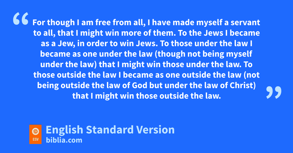 19 For hthough I am free from all, iI have made myself a servant to all, that I might jwin more of them. 20 kTo the Jews I became as a Jew, in order to win Jews. To those under the law I became as one under the law (though not being myself under the law) that I might win those under the law. 21 To lthose outside the law I became mas one outside the law (not being outside the law of God but nunder the law of Christ) that I might win those outside the law. 22 oTo the weak I became weak, that I might win the weak. pI have become all things to all people, that qby all means I might save some. 23 I do it all for the sake of the gospel, rthat I may share with them in its blessings.