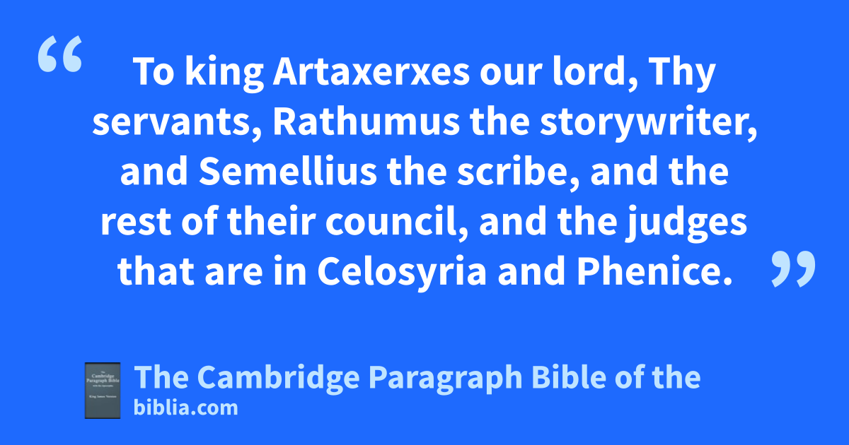16 * fBut in the time of Artaxerxes king of the Persians, Belemus, and Mithridates, and Tabellius, and * Rathumus, and Beeltethmus, and * Semellius the gsecretary, with others that were in commission with them, dwelling in Samaria and other places, wrote unto him against them that dwelt in Judea and Jerusalem these letters following; 17 To king Artaxerxes our lord, Thy servants, Rathumus the hstorywriter, and Semellius the gscribe, and the rest of their council, and the judges that are in iCelosyria and ikPhenice. 18 Be it now known to the lord king, that the Jews that are come up from you to us, being come into Jerusalem, (that rebellious and wicked city,) do build the marketplaces, and repair the walls of it, and do lay the foundation of the temple. 19 Now if this city and the walls thereof be made up again, they will not only refuse to give tribute, but also rebel against kings. 20 And forasmuch as the things pertaining to the temple are now in hand, we think it meet not to neglect such a matter, 21 but to speak unto our lord the king, to the intent that, if it be thy pleasure, it may be sought out in the books of thy fathers: 22 and thou shalt find in the chronicles what is written concerning these things, and shalt understand that that city was rebellious, troubling both kings and cities: 23 and that the Jews were rebellious, and raised always wars therein; for the which cause even this city was made desolate. 24 Wherefore now we do declare unto thee, O lord the king, that if this city be built again, and the walls thereof set up anew, thou shalt from henceforth have no passage into iCoelosyria and Phenice.