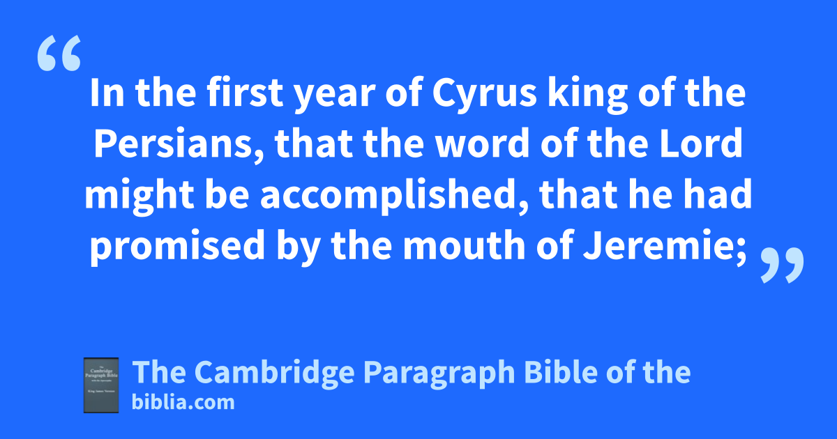 II. * aIn the first year of Cyrus king of the Persians, that the word of the Lord might be accomplished, that he had promised by the mouth of Jeremie; 2 the Lord craised up the spirit of Cyrus the king of the Persians, and he made proclamation through all his kingdom, and also by writing, 3 saying, Thus saith Cyrus king of the Persians; The Lord of Israel, the most high Lord, hath bmade me king of the whole world, 4 and commanded me to build him a house at Jerusalem in Jewry. 5 If therefore there be any of you that are of his people, let the Lord, even his Lord, be with him, and let him go up to Jerusalem that is in Judea, and build the house of the Lord of Israel: for * he is the Lord that dwelleth in Jerusalem. 6 Whosoever then dwell in the places about, let them help him, (those, I say, that are his neighbours) with gold and with silver, 7 with gifts, with horses, and with cattle, and other things, which have been set forth by vow, for the temple of the Lord at Jerusalem.