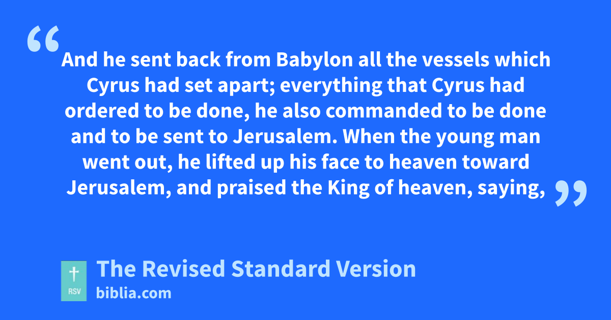 42 Then the king said to him, “Ask what you wish, even beyond what is written, and we will give it to you, for you have been found to be the wisest. And you shall sit next to me, and be called my kinsman.” 43 Then he said to the king, “Remember the vow which you made to build Jerusalem, in the day when you became king, 44 and to send back all the vessels that were taken from Jerusalem, which Cyrus set apart when he began to destroy Babylon, and vowed to send them back there. 45 You also vowed to build the temple, which the Edomites burned when Judea was laid waste by the Chaldeans. 46 And now, O lord the king, this is what I ask and request of you, and this befits your greatness. I pray therefore that you fulfil the vow whose fulfilment you vowed to the King of heaven with your own lips.”