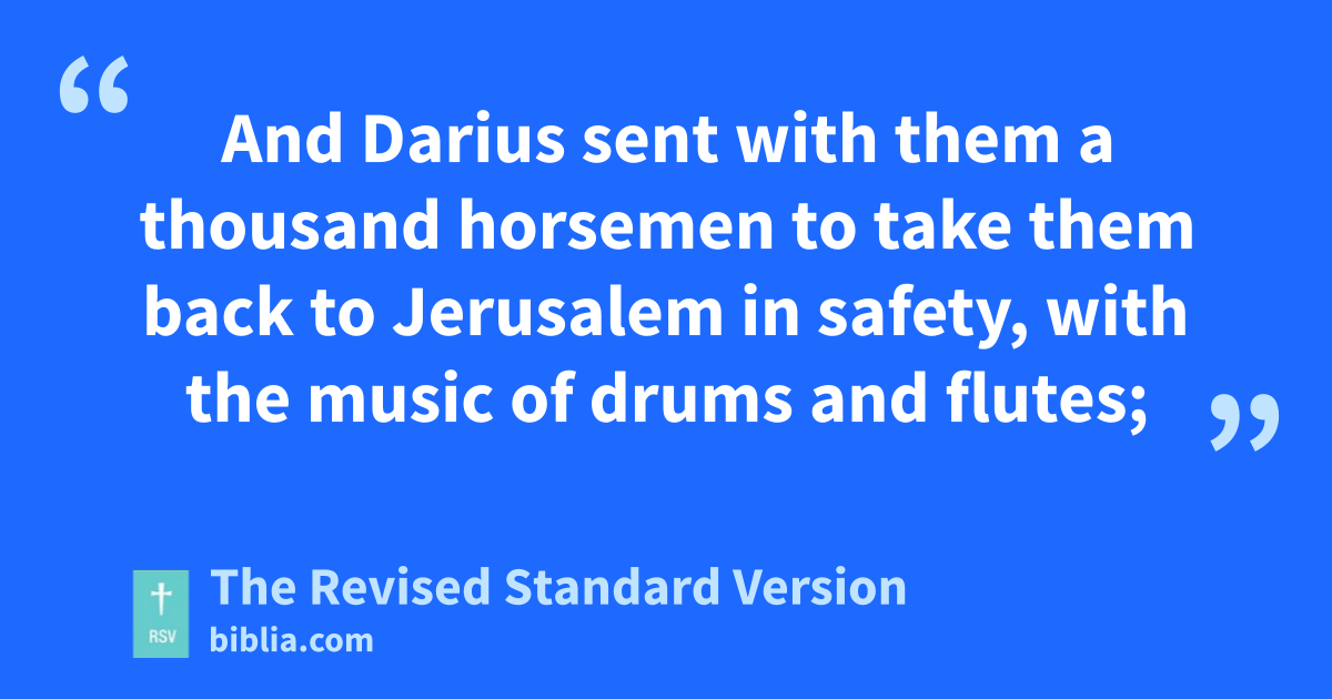 1 After this the heads of fathers’ houses were chosen to go up, according to their tribes, with their wives and sons and daughters, and their menservants and maidservants, and their cattle. 2 And Darius sent with them a thousand horsemen to take them back to Jerusalem in safety, with the music of drums and flutes; 3 and all their brethren were making merry. And he made them go up with them.
