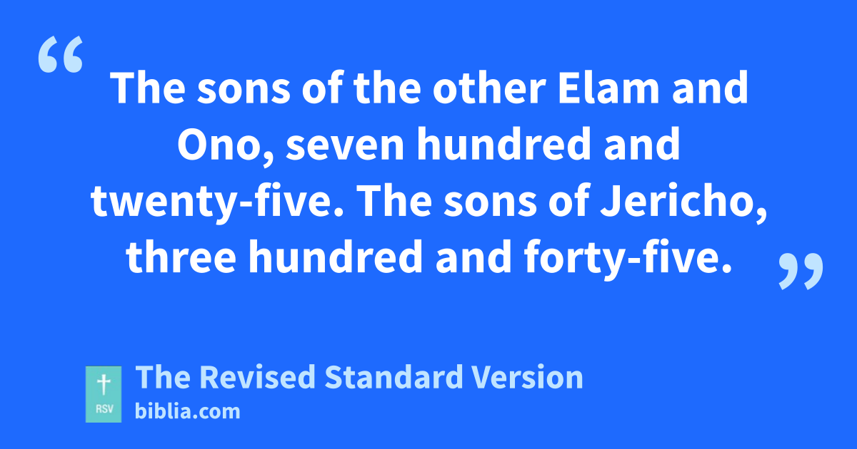 9 The number of the men of the nation and their leaders: the sons of Parosh, two thousand one hundred and seventy-two. The sons of Shephatiah, four hundred and seventy-two. 10 The sons of Arah, seven hundred and fifty-six. 11 The sons of Pahathmoab, of the sons of Jeshua and Joab, two thousand eight hundred and twelve. 12 The sons of Elam, one thousand two hundred and fifty-four. The sons of Zattu, nine hundred and forty-five. The sons of Chorbe, seven hundred and five. The sons of Bani, six hundred and forty-eight. 13 The sons of Bebai, six hundred and twenty-three. The sons of Azgad, one thousand three hundred and twenty-two. 14 The sons of Adonikam, six hundred and sixty-seven. The sons of Bigvai, two thousand and sixty-six. The sons of Adin, four hundred and fifty-four. 15 The sons of Ater, namely of Hezekiah, ninety-two. The sons of Kilan and Azetas, sixty-seven. The sons of Azaru, four hundred and thirty-two. 16 The sons of Annias, one hundred and one. The sons of Arom. The sons of Bezai, three hundred and twenty-three. The sons of Jorah, one hundred and twelve. 17 The sons of Baiterus, three thousand and five. The sons of Bethlehem, one hundred and twenty-three. 18 The men of Netophah, fifty-five. The men of Anathoth, one hundred and fifty-eight. The men of Bethasmoth, forty-two. 19 The men of Kiriatharim, twenty-five. The men of Chephirah and Beeroth, seven hundred and forty-three. 20 The Chadiasans and Ammidians, four hundred and twenty-two. The men of Ramah and Geba, six hundred and twenty-one. 21 The men of Michmas, one hundred and twenty-two. The men of Bethel, fifty-two. The sons of Magbish, one hundred and fifty-six. 22 The sons of the other Elam and Ono, seven hundred and twenty-five. The sons of Jericho, three hundred and forty-five. 23 The sons of Senaah, three thousand three hundred and thirty.