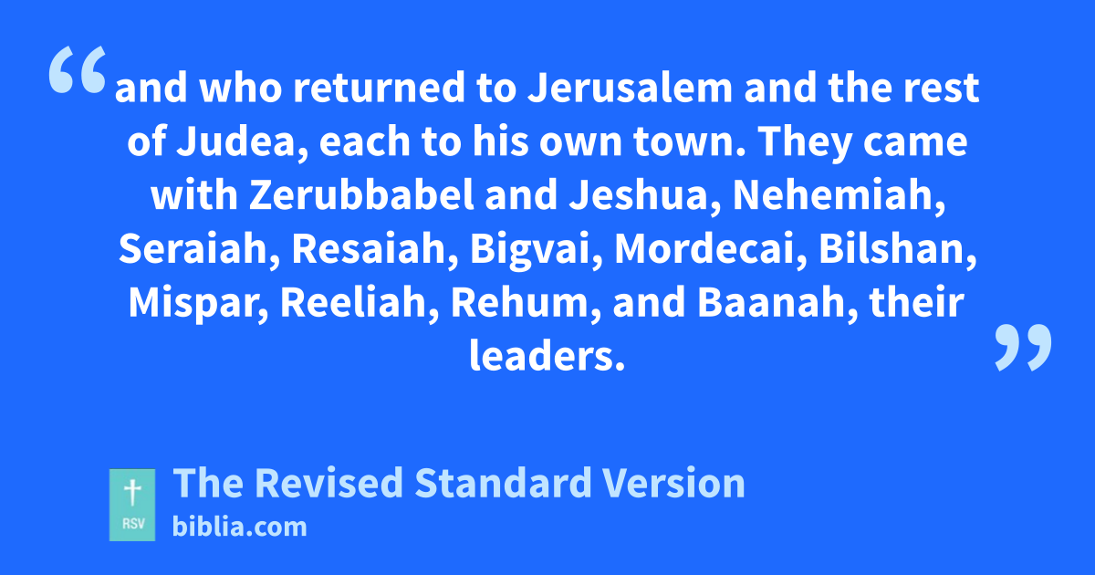 7 These are the men of Judea who came up out of their sojourn in captivity, whom Nebuchadnezzar king of Babylon had carried away to Babylon 8 and who returned to Jerusalem and the rest of Judea, each to his own town. They came with Zerubbabel and Jeshua, Nehemiah, Seraiah, Resaiah, Bigvai, Mordecai, Bilshan, Mispar, Reeliah, Rehum, and Baanah, their leaders.