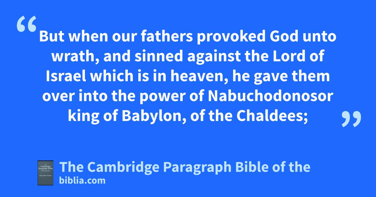 8 To king Darius, greeting. Let all things be known unto our lord the king, that being come into the country of Judea, and entered into the city of Jerusalem, we found in the city of Jerusalem the eancients of the Jews that were of the captivity, 9 building a house unto the Lord, great and new, of hewn and costly stones, and the timber already laid upon the walls. 10 And those works are done with great speed, and the work goeth on prosperously in their hands, and with all glory and diligence is it made. 11 Then asked we these eelders, saying, By whose commandment build you this house, and lay the foundations of these works? 12 Therefore to the intent that we might give knowledge unto thee by writing, we demanded of them who were the chief doers, and we required of them the names in writing of their principal men. 13 So they gave us this answer, We are the servants of the Lord which made heaven and earth. 14 And as for this house, it was builded many years ago by a king of Israel great and strong, and was finished. 15 But when our fathers fprovoked God unto wrath, and sinned against the Lord of Israel which is in heaven, he gave them over into the power of Nabuchodonosor king of Babylon, of the Chaldees; 16 who pulled down the house, and burnt it, and carried away the people captives unto Babylon. 17 But in the first year that king Cyrus reigned over the country of Babylon, Cyrus the king wrote to build up this house. 18 And the holy vessels of gold and of silver, that Nabuchodonosor had carried away out of the house at Jerusalem, and had gset them in his own temple, hthose Cyrus the king brought forth again out of the temple at Babylon, and they were delivered to * Zorobabel and to Sanabassarus the ruler, 19 with commandment that he should carry away the same vessels, and put them in the temple at Jerusalem; and that the temple of the Lord should be built in his place. 20 Then the same Sanabassarus, being come hither, laid the foundations of the house of the Lord at Jerusalem; and from that time to this being still a building, it is not yet fully ended. 21 Now therefore, if it seem good unto the king, let search be made among the * records of king Cyrus: 22 and if it be found that the building of the house of the Lord at Jerusalem hath been done with the consent of king Cyrus, and if our lord the king be so minded, let him signify unto us thereof.
