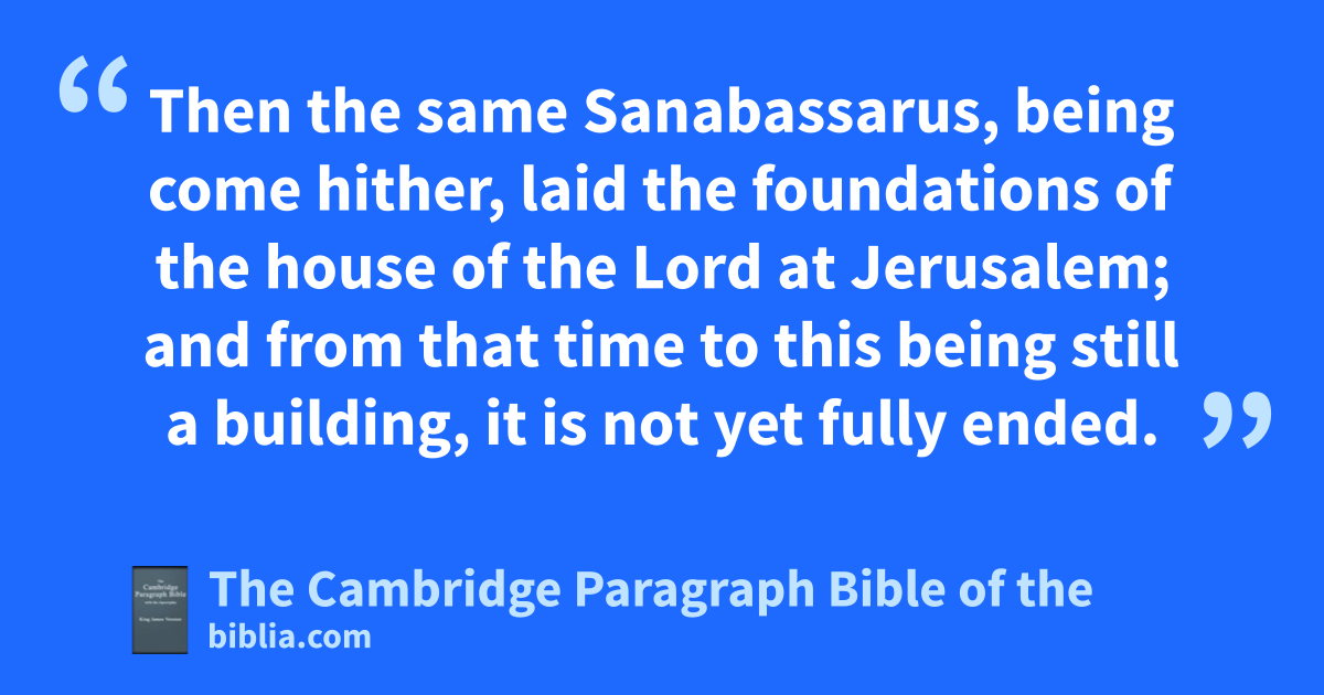 8 To king Darius, greeting. Let all things be known unto our lord the king, that being come into the country of Judea, and entered into the city of Jerusalem, we found in the city of Jerusalem the eancients of the Jews that were of the captivity, 9 building a house unto the Lord, great and new, of hewn and costly stones, and the timber already laid upon the walls. 10 And those works are done with great speed, and the work goeth on prosperously in their hands, and with all glory and diligence is it made. 11 Then asked we these eelders, saying, By whose commandment build you this house, and lay the foundations of these works? 12 Therefore to the intent that we might give knowledge unto thee by writing, we demanded of them who were the chief doers, and we required of them the names in writing of their principal men. 13 So they gave us this answer, We are the servants of the Lord which made heaven and earth. 14 And as for this house, it was builded many years ago by a king of Israel great and strong, and was finished. 15 But when our fathers fprovoked God unto wrath, and sinned against the Lord of Israel which is in heaven, he gave them over into the power of Nabuchodonosor king of Babylon, of the Chaldees; 16 who pulled down the house, and burnt it, and carried away the people captives unto Babylon. 17 But in the first year that king Cyrus reigned over the country of Babylon, Cyrus the king wrote to build up this house. 18 And the holy vessels of gold and of silver, that Nabuchodonosor had carried away out of the house at Jerusalem, and had gset them in his own temple, hthose Cyrus the king brought forth again out of the temple at Babylon, and they were delivered to * Zorobabel and to Sanabassarus the ruler, 19 with commandment that he should carry away the same vessels, and put them in the temple at Jerusalem; and that the temple of the Lord should be built in his place. 20 Then the same Sanabassarus, being come hither, laid the foundations of the house of the Lord at Jerusalem; and from that time to this being still a building, it is not yet fully ended. 21 Now therefore, if it seem good unto the king, let search be made among the * records of king Cyrus: 22 and if it be found that the building of the house of the Lord at Jerusalem hath been done with the consent of king Cyrus, and if our lord the king be so minded, let him signify unto us thereof.