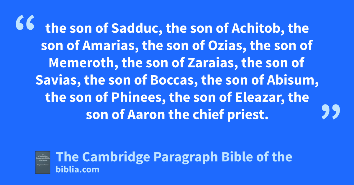 VIII. * aAnd after these things, when Artaxerxes the king of the Persians reigned, came Esdras the son of Saraias, the son of * Ezerias, the son of Helchiah, the son of Salum, 2 the son of Sadduc, the son of Achitob, the son of Amarias, the son of * Ozias, the son of * b* Memeroth, the son of * Zaraias, the son of * * Savias, the son of Boccas, the son of Abisum, the son of Phinees, the son of Eleazar, the son of Aaron * the chief priest. 3 This Esdras went up from Babylon, as a scribe, being very ready in the law of Moses, that was given by the God of Israel. 4 And the king did him honour: for he found grace in his sight in all his requests. 5 There went up with him also certain of the children of Israel, of the priest, of the Levites, of the holy singers, porters, and * ministers of the temple, unto Jerusalem, 6 in the seventh year of the reign of Artaxerxes, in the fifth month, this was the king’s seventh year; for they went from Babylon in the first day of the first month, and came to Jerusalem, according to the * dprosperous journey which the Lord gave them. 7 For Esdras had very great skill, so that he omitted nothing of the law and commandments of the Lord, but taught all Israel the ordinances and judgments. 8 Now the copy of the * commission, which was written from Artaxerxes the king, and came to Esdras the priest and ereader of the law of the Lord, is this that followeth: