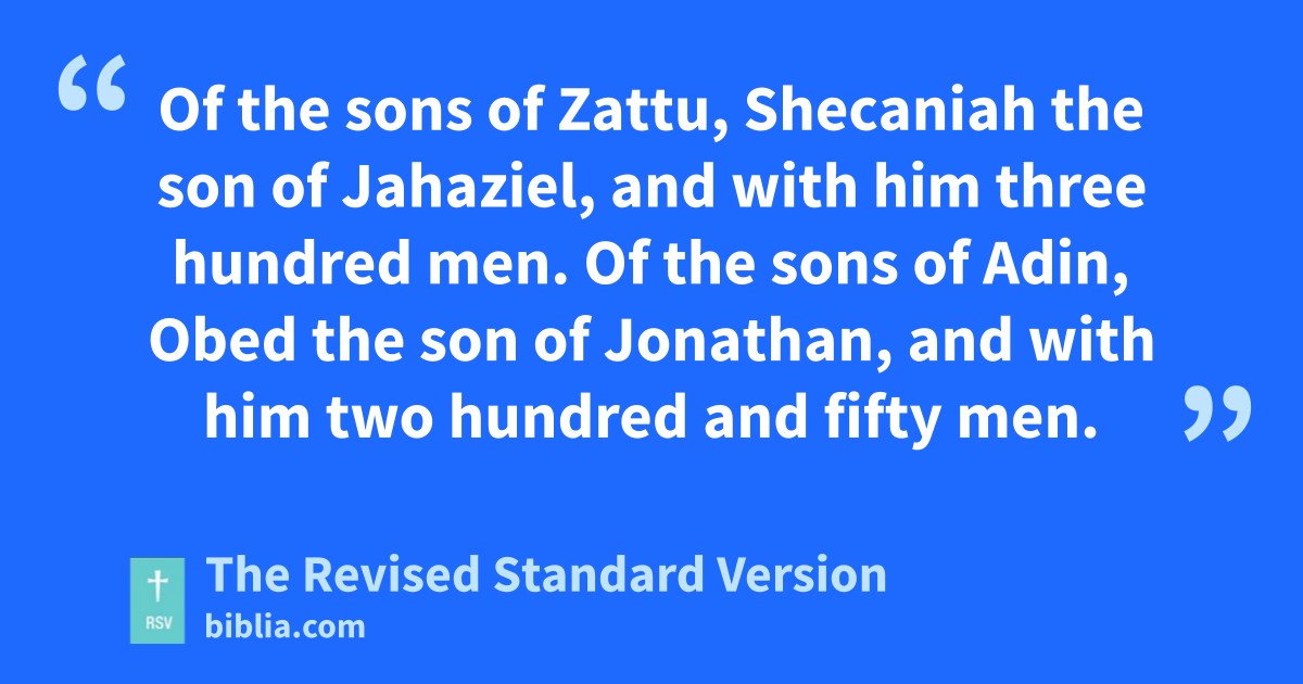 28 These are the principal men, according to their fathers’ houses and their groups, who went up with me from Babylon, in the reign of Artaxerxes the king: 29 Of the sons of Phineas, Gershom. Of the sons of Ithamar, Gamael. Of the sons of David, Hattush the son of Shecaniah. 30 Of the sons of Parosh, Zechariah, and with him a hundred and fifty men enrolled. 31 Of the sons of Pahathmoab, Eliehoenai the son of Zerahiah, and with him two hundred men. 32 Of the sons of Zattu, Shecaniah the son of Jahaziel, and with him three hundred men. Of the sons of Adin, Obed the son of Jonathan, and with him two hundred and fifty men. 33 Of the sons of Elam, Jeshaiah the son of Gotholiah, and with him seventy men. 34 Of the sons of Shephatiah, Zeraiah the son of Michael, and with him seventy men, 35 Of the sons of Joab, Obadiah the son of Jehiel, and with him two hundred and twelve men. 36 Of the sons of Bani, Shelomith the son of Josiphiah, and with him a hundred and sixty men. 37 Of the sons of Bebai, Zechariah the son of Bebai, and with him twenty-eight men. 38 Of the sons of Azgad, Johanan the son of Hakkatan, and with him a hundred and ten men. 39 Of the sons of Adonikam, the last ones, their names being Eliphelet, Jeuel, and Shemaiah, and with them seventy men. 40 Of the sons of Bigvai, Uthai the son of Istalcurus, and with him seventy men.
