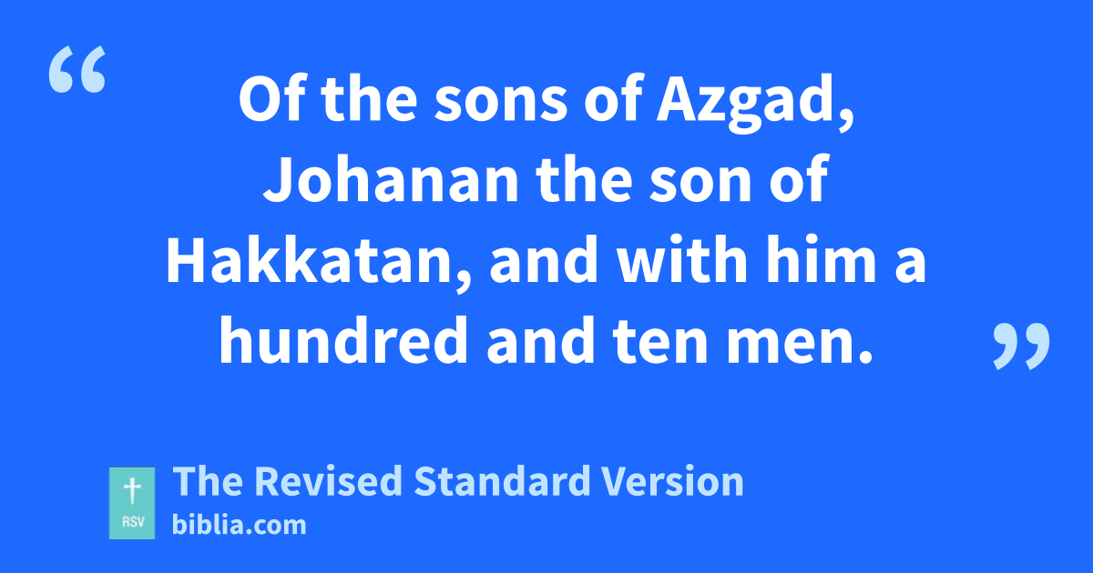 28 These are the principal men, according to their fathers’ houses and their groups, who went up with me from Babylon, in the reign of Artaxerxes the king: 29 Of the sons of Phineas, Gershom. Of the sons of Ithamar, Gamael. Of the sons of David, Hattush the son of Shecaniah. 30 Of the sons of Parosh, Zechariah, and with him a hundred and fifty men enrolled. 31 Of the sons of Pahathmoab, Eliehoenai the son of Zerahiah, and with him two hundred men. 32 Of the sons of Zattu, Shecaniah the son of Jahaziel, and with him three hundred men. Of the sons of Adin, Obed the son of Jonathan, and with him two hundred and fifty men. 33 Of the sons of Elam, Jeshaiah the son of Gotholiah, and with him seventy men. 34 Of the sons of Shephatiah, Zeraiah the son of Michael, and with him seventy men, 35 Of the sons of Joab, Obadiah the son of Jehiel, and with him two hundred and twelve men. 36 Of the sons of Bani, Shelomith the son of Josiphiah, and with him a hundred and sixty men. 37 Of the sons of Bebai, Zechariah the son of Bebai, and with him twenty-eight men. 38 Of the sons of Azgad, Johanan the son of Hakkatan, and with him a hundred and ten men. 39 Of the sons of Adonikam, the last ones, their names being Eliphelet, Jeuel, and Shemaiah, and with them seventy men. 40 Of the sons of Bigvai, Uthai the son of Istalcurus, and with him seventy men.