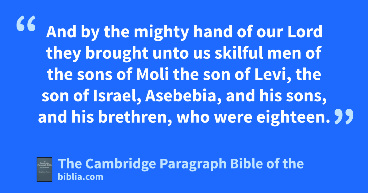 41 And these I gathered together * to the river called Theras, where we pitched our tents three days: and then * I surveyed them. 42 * But when I had found there none of the priests and Levites, 43 then sent I unto Eleazar, and aIduel, and bMasman, 44 and Alnathan, and Mamaias, and cJoribus, and Nathan, Eunatan, Zacharias, and Mosollamus, principal men and learned. 45 And I bade them that they should go unto dSaddeus the captain, ewho was in the place of fthe treasury: 46 and commanded them that they should speak unto dDaddeus, and to ghis brethren, and to the treasurers in that place, to send us such men as might execute the priests’ office in the house of the Lord. 47 And by the mighty hand of our Lord they brought unto us skilful men of the sons of hMoli the son of Levi, the son of Israel, iAsebebia, and his sons, and his brethren, who were eighteen. 48 jAnd Asebia, and Annuus, and Osaias his brother, of the sons of Channuneus, and their sons, were twenty men. 49 And lof the servants of the temple whom David had ordained, and the principal men for the service of the Levites, to wit, kthe servants of the temple, two hundred and twenty, the catalogue of whose names was shewed. 50 And there I * vowed a fast unto the young men before our Lord, to desire of him la prosperous journey both for us and them that were with us, for our children, and for the * cattle: 51 for mI was ashamed to ask the king footmen, and horsemen, and conduct for safeguard against our adversaries. 52 For we had said unto the king, that the power of the Lord our God should be with them that seek him, to support them in all ways. 53 And again we besought our Lord as touching these things, and found him favourable unto us.