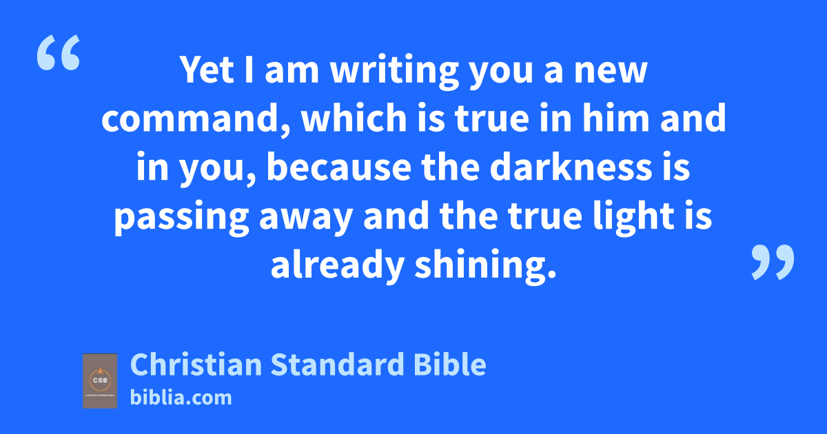 7 Dear friends, I am not writing you a new commandaa but an old command that you have had from the beginning. The old command is the wordab you have heard. 8 Yet I am writing you a new command, which is true in him and in you, because the darkness is passing awayac and the true lightad is already shining.ae 9 The one who says he is in the light but hates his brother or sisteraf is in the darkness until now. 10 The one who loves his brother or sisterag remains in the light, and there is no cause for stumbling in him.D 11 But the one who hates his brother or sisterah is in the darkness, walks in the darkness,ai and doesn’t know where he’s going,aj because the darkness has blinded his eyes.
