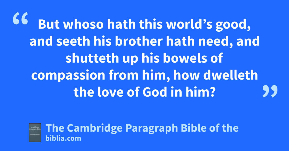 III. Behold, awhat manner of love the Father hath bestowed upon us, that bwe should be called cthe sons of God: therefore the world knoweth us not, because dit knew him not. 2 Beloved, enow are we cthe sons of God, and fit doth not yet appear what we shall be: but gwe know that, hwhen he shall appear, iwe shall be like him; for kwe shall lsee him as he is. 3 And every man mthat hath this hope in him npurifieth himself, oeven as he is pure. 4 Whosoever committeth sin transgresseth also the law: for psin is the transgression of the law. 5 And ye know that qrhe was manifested rsto take away our sins; and tin him is no sin. 6 Whosoever abideth in him sinneth not: whosoever sinneth uhath not seen him, vneither known him. 7 Little children, wlet no man deceive you: xhe that doeth righteousness is righteous, oeven as he is righteous. 8 yHe that committeth sin is of the devil; for zthe devil sinneth from the beginning. For this purpose the Son of God was manifested, athat he might bdestroy the works of the devil. 9 cWhosoever is born of God doth not commit sin; for dhis seed remaineth in him: and he cannot sin, because ehe is born of God. 10 In this fthe children of God are manifest, and gthe children of the devil: hwhosoever doeth not righteousness is not of God, neither ihe that loveth not his brother. 11 For kthis is the * message lthat ye heard from the beginning, mthat we should love one another. 12 Not as nCain, who was of othat wicked one, and slew his brother. And wherefore slew he him? pBecause his own works were evil, and his brother’s righteous. 13 Marvel not, my brethren, if qthe world hate you. 14 rWe know that swe have passed from death unto life, because we love the brethren. He that loveth not his brother abideth in death. 15 tWhosoever hateth his brother is ua murderer: and ye know that vno murderer hath eternal life abiding in him. 16 wxHereby perceive we the love of God, because xhe laid down his life for us: and ywe ought to lay down our lives for the brethren. 17 But zwhoso hath this world’s agood, and seeth his brother hath need, and bshutteth up chis bowels of compassion from him, dhow dwelleth the love of God in him? 18 My little children, elet us not love in word, neither in tongue; but in deed and eein truth. 19 And hereby we know that we are fof the truth, and gshall * assure our hearts before him. 20 For hif our heart condemn us, God is greater than our heart, and knoweth all things. 21 Beloved, iif our heart condemn us not, then jhave we confidence ktowards God. 22 And lwhatsoever we ask, we receive of him, because we mkeep his commandments, and do nthose things that are pleasing in his sight. 23 And this is his commandment, oThat we should believe on the name of his Son Jesus Christ, and plove one another, qas he gave us commandment. 24 And he that mkeepeth his commandments rdwelleth in him, and rshe in him. And thereby we know that he abideth in us, by the Spirit which he hath given us.