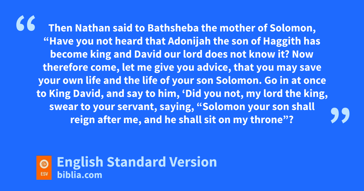 11 Then Nathan said to Bathsheba the mother of Solomon, “Have you not heard that bAdonijah the son of Haggith has become king and David our lord does not know it? 12 Now therefore come, let me give you advice, that you may save your own life and the life of your son Solomon. 13 Go in at once to King David, and say to him, ‘Did you not, my lord the king, swear to your servant, saying, m“Solomon your son shall reign after me, and he shall sit on my throne”? Why then is Adonijah king?’ 14 Then while you are still speaking with the king, I also will come in after you and confirm2 your words.”