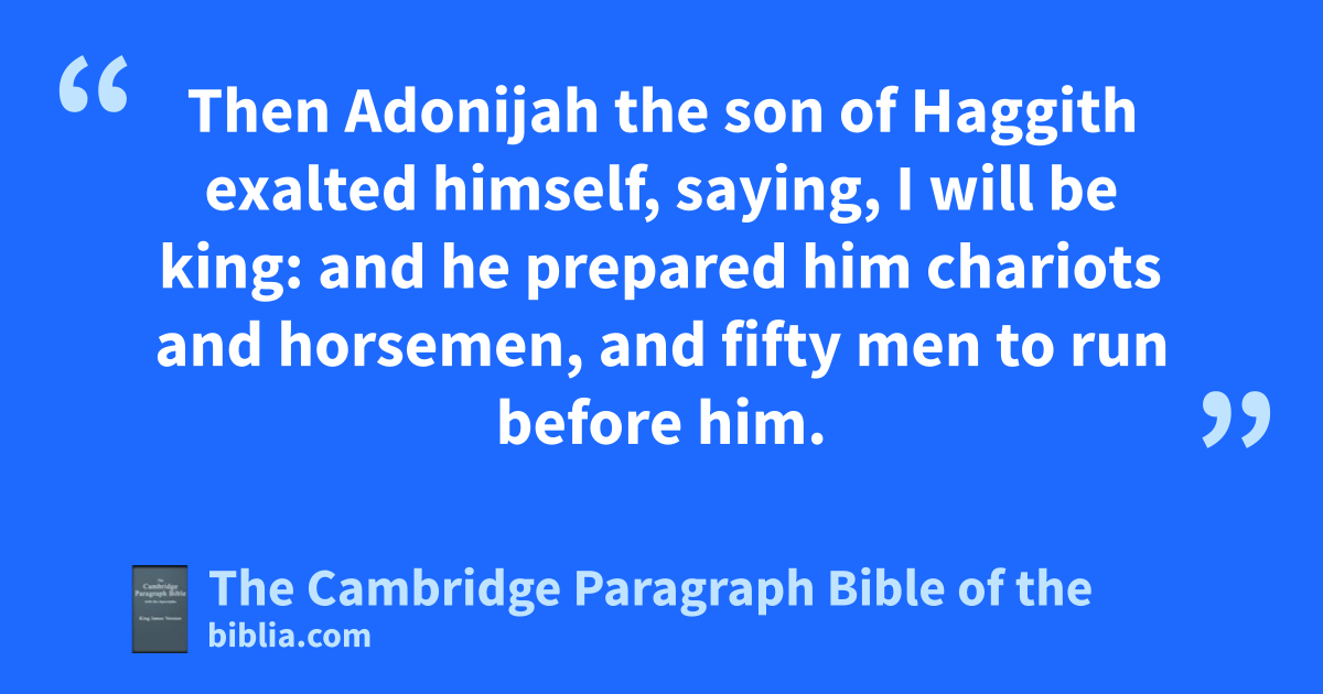 5 Then bAdonijah the son of Haggith exalted himself, saying, I will * be king: and che prepared him chariots and horsemen, and fifty men to run before him. 6 And his father had not displeased him * at any time in saying, Why hast thou done so? and he also was a very goodly man; dand his mother bare him after Absalom. 7 And * he conferred with Joab the son of Zeruiah, and with eAbiathar the priest: and fthey * following Adonijah helped him. 8 But eZadok the priest, and gBenaiah the son of Jehoiada, and hNathan the prophet, and iShimei, and Rei, and jthe mighty men which belonged to David, were not with Adonijah. 9 And Adonijah slew sheep and oxen and fat cattle by the stone of Zoheleth, which is by * En-rogel, and called all his brethren the king’s sons, and all the men of Judah the king’s servants: 10 but Nathan the prophet, and Benaiah, and the mighty men, and kSolomon his brother, he called not.