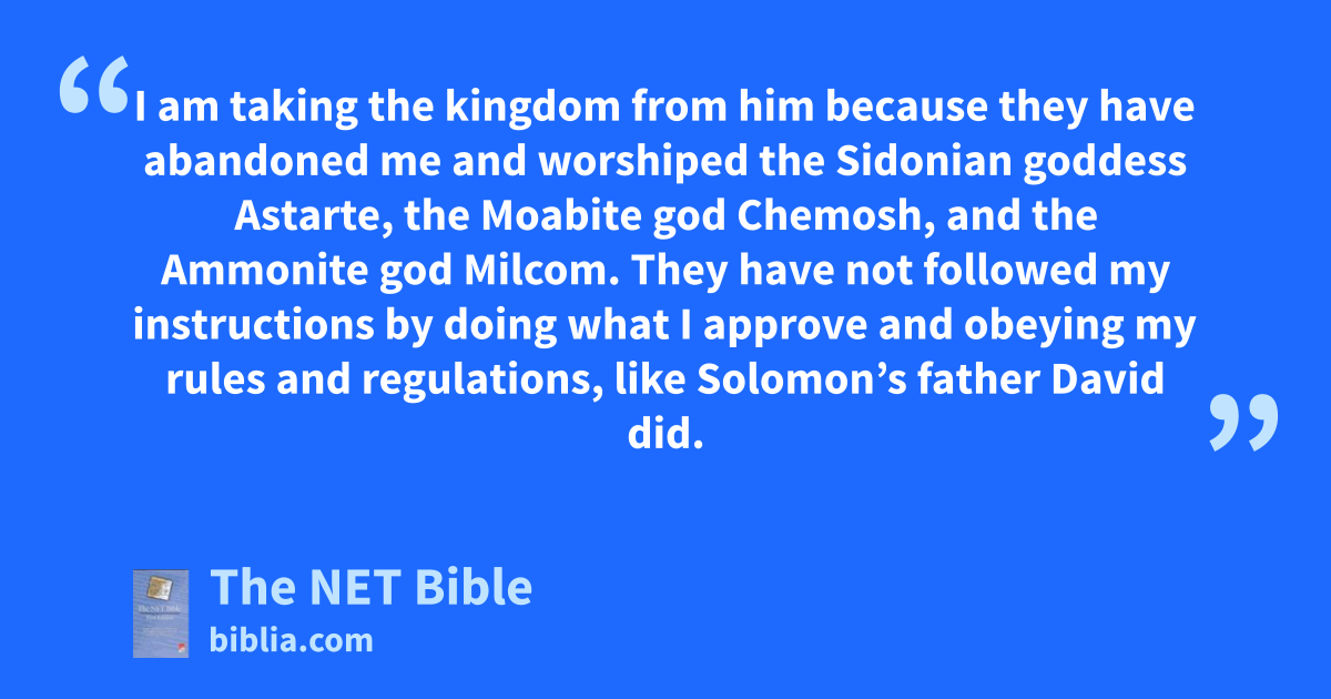 11:9 The Lord was angry with Solomon because he had shifted his allegiance19 away from the Lord, the God of Israel, who had appeared to him on two occasions20 11:10 and had warned him about this very thing, so that he would not follow other gods.21 But he did not obey22 the Lord’s command. 11:11 So the Lord said to Solomon, “Because you insist on doing these things and have not kept the covenantal rules I gave you,23 I will surely tear the kingdom away from you and give it to your servant. 11:12 However, for your father David’s sake I will not do this while you are alive. I will tear it away from your son’s hand instead. 11:13 But I will not tear away the entire kingdom; I will leave24 your son one tribe for my servant David’s sake and for the sake of my chosen city Jerusalem.”