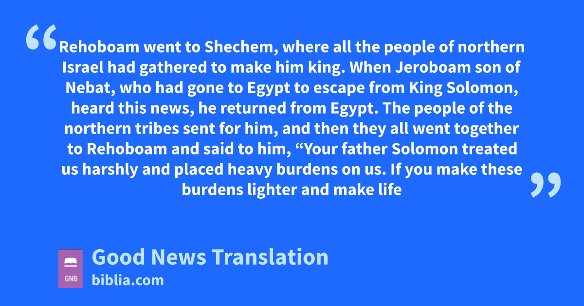 12 Rehoboam went to Shechem, where all the people of northern Israel had gathered to make him king. 2When Jeroboam son of Nebat, who had gone to Egypt to escape from King Solomon, heard this news, he returned fromo Egypt. 3The people of the northern tribes sent for him, and then they all went together to Rehoboam and said to him, 4“Your father Solomon treated us harshly and placed heavy burdens on us. If you make these burdens lighter and make life easier for us, we will be your loyal subjects.”