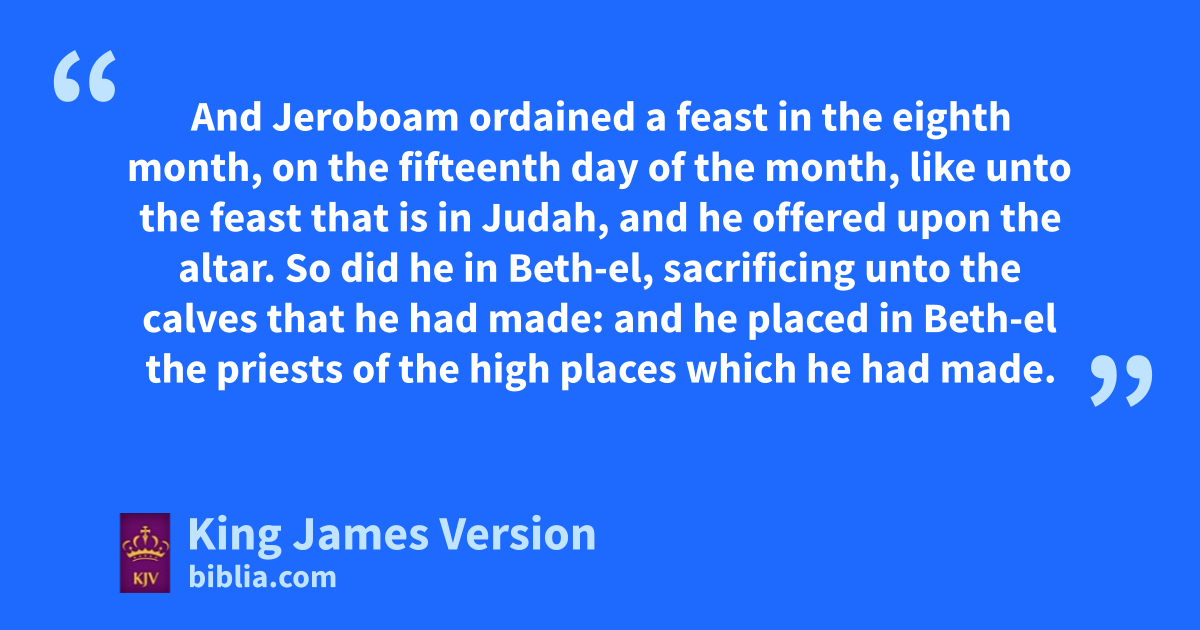 25 Then Jeroboam xbuilt Shechem yin mount Ephraim, and dwelt therein; and went out from thence, and built zPenuel. 26 And Jeroboam said in his heart, Now shall the kingdom return to the house of David: 27 If athis people go up to do sacrifice in the house of the Lord at Jerusalem, then shall the heart of this people turn again unto their lord, even unto Rehoboam king of Judah, and they shall kill me, and go again to Rehoboam king of Judah. 28 Whereupon the king took counsel, and made btwo calves of gold, and said unto them, It is too much for you to go up to Jerusalem: cbehold thy gods, O Israel, which brought thee up out of the land of Egypt. 29 And he set the one in dBeth-el, and the other put he in eDan. 30 fAnd this thing became a sin: for the people went to worship before gthe one, even unto eDan. 31 And he made han house of high places, and imade priests of the lowest of the people, which were not of the sons of Levi. 32 And Jeroboam ordained a feast in the eighth month, on the fifteenth day of the month, like unto jthe feast that is in Judah, and he ||offered upon the altar. So did he in Beth-el, ||sacrificing unto the calves that he had made: and he placed in Beth-el kthe priests of the high places which he had made. 33 So he ||offered upon the altar which he had made in Beth-el the fifteenth day of the eighth month, even in the month which he had ldevised of his own heart; and ordained a feast unto the children of Israel: and he ||offered upon the altar, †and burnt incense.