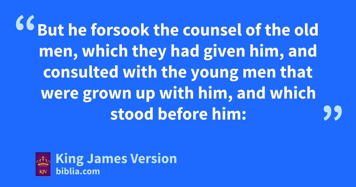 12 And aRehoboam went to bShechem: for all Israel were come to Shechem to make him king. 2 And it came to pass, when cJeroboam the son of Nebat, who was yet in dEgypt, heard of it, (for he was fled from the presence of king Solomon, and Jeroboam dwelt in Egypt;) 3 That they sent and called him. And Jeroboam and all the congregation of Israel came, and spake unto Rehoboam, saying, 4 eThy father made our yoke grievous: now therefore make thou the grievous service of thy father, and his heavy yoke which he put upon us, lighter, and we will serve thee. 5 And he said unto them, Depart yet for three days, then come again to me. And the people departed. 6 And king Rehoboam consulted with the old men, that fstood before Solomon his father while he yet lived, and said, How do ye advise that I may answer this people? 7 And they spake unto him, saying, gIf thou wilt be a servant unto this people this day, and wilt serve them, and answer them, and speak good words to them, then they will be thy servants for ever. 8 But he forsook the counsel of the old men, which they had given him, and consulted with the young men that were grown up with him, and which fstood before him: 9 And he said unto them, What counsel give ye that we may answer this people, who have spoken to me, saying, Make the yoke which thy father did put upon us lighter? 10 And the young men that were grown up with him spake unto him, saying, Thus shalt thou speak unto this people that spake unto thee, saying, Thy father made our yoke heavy, but make thou it lighter unto us; thus shalt thou say unto them, My little finger shall be thicker than my father’s loins. 11 And now whereas my father did lade you with a heavy yoke, I will add to your yoke: my father hath chastised you with hwhips, but I will chastise you with iscorpions. 12 So Jeroboam and all the people came to Rehoboam the third day, jas the king had appointed, saying, Come to me again the third day. 13 And the king answered the people †roughly, and forsook the old men’s counsel that they gave him; 14 And spake to them after the counsel of the young men, saying, kMy father made your yoke heavy, and I will add to your yoke: my father also chastised you with whips, but I will chastise you with scorpions. 15 Wherefore the king hearkened not unto the people; for the cause was lfrom the Lord, that he might perform his saying, which mthe Lord spake by Ahijah the Shilonite unto Jeroboam the son of Nebat.