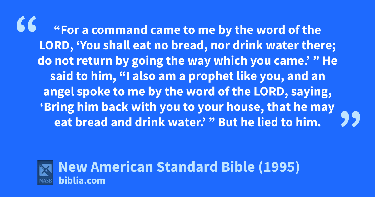 18 He said to him, “aI also am a prophet like you, and ban angel spoke to me by the word of the Lord, saying, ‘Bring him back with you to your house, that he may eat bread and drink water.’ ” But che lied to him.