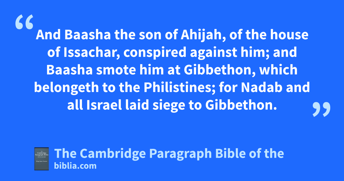 25 And j* Nadab the son of Jeroboam * began to reign over Israel in the second year of Asa king of Judah, and reigned over Israel two years. 26 And he did evil in the sight of the Lord, and walked in the way of his father, and in his sin kwherewith he made Israel to sin. 27 lAnd Baasha the son of Ahijah, of the house of Issachar, conspired against him; and Baasha smote him at mGibbethon, which belongeth to the Philistines; for Nadab and all Israel laid siege to Gibbethon. 28 Even in the third year of Asa king of Judah did Baasha slay him, and reigned in his stead. 29 And it came to pass, when he reigned, that he smote all the house of Jeroboam; he left not to Jeroboam any that breathed, until he had destroyed him, according unto nthe saying of the Lord, which he spake by his servant oAhijah the Shilonite: 30 because of pthe sins of Jeroboam which he sinned, and which he made Israel sin, by his provocation wherewith he provoked the Lord God of Israel to anger. 31 Now the rest of the acts of Nadab, and all that he did, are they not written in the book of the chronicles of the kings of Israel?