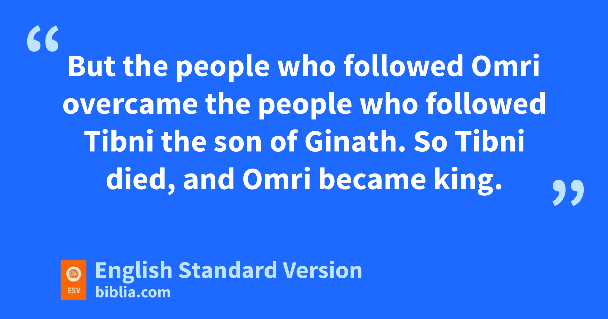 21 Then the people of Israel were divided into two parts. Half of the people followed Tibni the son of Ginath, to make him king, and half followed Omri. 22 But the people who followed Omri overcame the people who followed Tibni the son of Ginath. So Tibni died, and Omri became king. 23 In the thirty-first year of Asa king of Judah, Omri began to reign over Israel, and he reigned for twelve years; six years he reigned in Tirzah. 24 He bought the hill of fSamaria from Shemer for two talents1 of silver, and he fortified the hill and called the name of the city that he built gSamaria, after the name of Shemer, the owner of the hill.