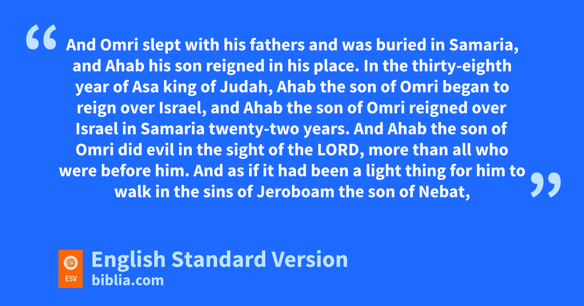 29 In the thirty-eighth year of Asa king of Judah, Ahab the son of Omri began to reign over Israel, and Ahab the son of Omri reigned over Israel in Samaria twenty-two years. 30 And Ahab the son of Omri did evil in the sight of the Lord, kmore than all who were before him. 31 And as if it had been a light thing for him to walk in the sins of Jeroboam the son of Nebat, lhe took for his wife Jezebel the daughter of Ethbaal king of the mSidonians, nand went and served Baal and worshiped him. 32 He erected an altar for Baal in othe house of Baal, which he built in Samaria. 33 And Ahab made an pAsherah. Ahab did more to provoke the Lord, the God of Israel, to anger kthan all the kings of Israel who were before him. 34 qIn his days Hiel of Bethel built rJericho. He laid its foundation at the cost of Abiram his firstborn, and set up its gates at the cost of his youngest son Segub, according to the word of the Lord, which he spoke by Joshua the son of Nun.