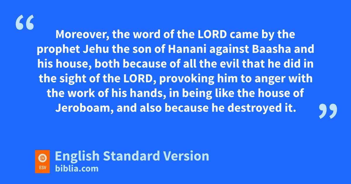 5 Now the rest of the acts of Baasha and what he did, and his might, are they not written in the Book of the Chronicles of the Kings of Israel? 6 And Baasha slept with his fathers and was buried at vTirzah, and Elah his son reigned in his place. 7 Moreover, the word of the Lord came by the prophet nJehu the son of Hanani against Baasha and his house, both because of all the evil that he did in the sight of the Lord, provoking him to anger with the work of his hands, in being like the house of Jeroboam, and also because whe destroyed it.