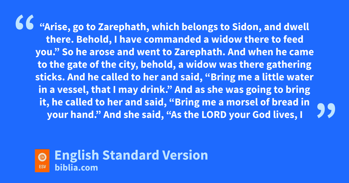 8 Then the word of the Lord came to him, 9 “Arise, go to wZarephath, which belongs to Sidon, and dwell there. Behold, I have commanded a widow there to feed you.” 10 So he arose and went to wZarephath. And when he came to the gate of the city, behold, a widow was there xgathering sticks. And he called to her and said, “Bring me a little water in a vessel, that I may drink.” 11 And as she was going to bring it, he called to her and said, “Bring me a morsel of bread in your hand.” 12 And she said, t“As the Lord your God lives, I have nothing baked, only a handful of flour in a jar and a little oil in a jug. And now I am gathering a couple of sticks that I may go in and prepare it for myself and my son, that we may eat it and die.” 13 And Elijah said to her, “Do not fear; go and do as you have said. But first make me a little cake of it and bring it to me, and afterward make something for yourself and your son. 14 For thus says the Lord, the God of Israel, ‘The jar of flour shall not be spent, and the jug of oil shall not be empty, until the day that the Lord sends rain upon the earth.’ ” 15 And she went and did as Elijah said. And she and he and her household ate for many days. 16 The jar of flour was not spent, neither did the jug of oil become empty, according to the word of the Lord that he spoke by Elijah.