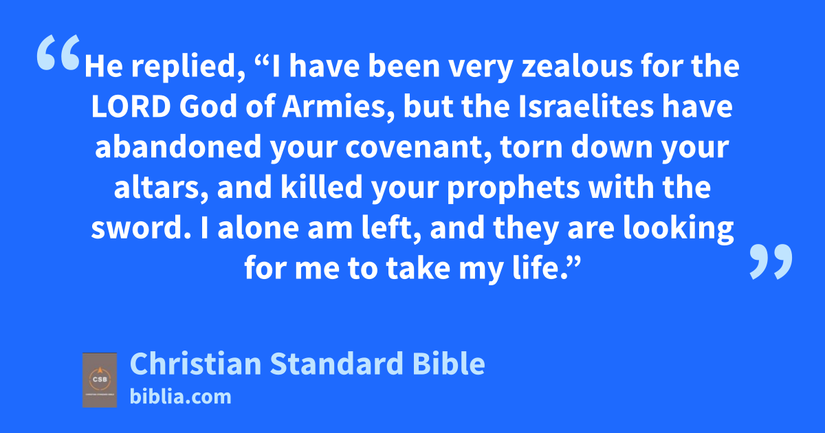 10 He replied, “I have been very zealousam for the Lord God of Armies, but the Israelites have abandoned your covenant,an torn down your altars,ao and killed your prophetsa with the sword. I alone am left,b and they are looking for me to take my life.”c