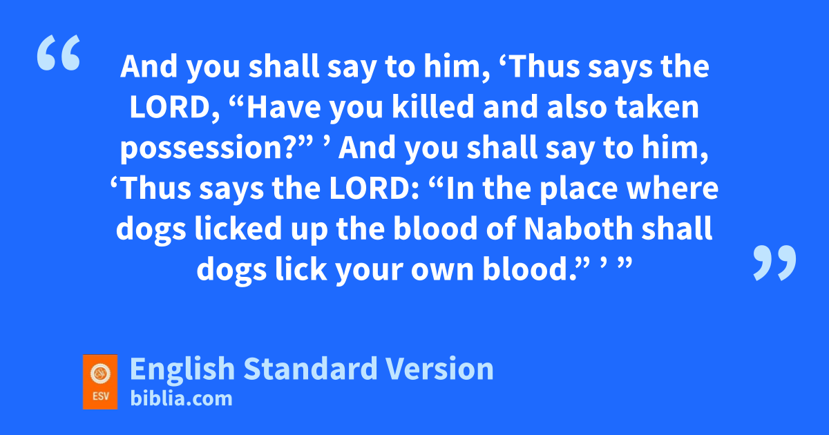 17 zThen the word of the Lord came to Elijah the Tishbite, saying, 18 “Arise, go down to meet Ahab king of Israel, who is in aSamaria; behold, he is in the vineyard of Naboth, where he has gone to take possession. 19 And you shall say to him, ‘Thus says the Lord, “Have you killed and also taken possession?” ’ And you shall say to him, ‘Thus says the Lord: b“In the place where dogs licked up the blood of Naboth shall dogs lick your own blood.” ’ ”
