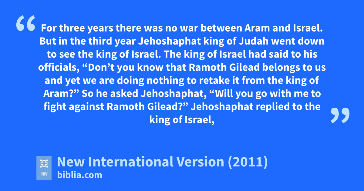 22 For three years there was no war between Aram and Israel. 2 But in the third year Jehoshaphat king of Judah went down to see the king of Israel. 3 The king of Israel had said to his officials, “Don’t you know that Ramoth Gileadd belongs to us and yet we are doing nothing to retake it from the king of Aram?”