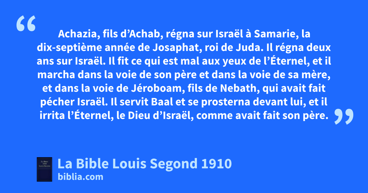 52Achazia, fils d’Achab, régna sur Israël à Samarie, la dix-septième année de Josaphat, roi de Juda. Il régna deux ans sur Israël. 53Il fit ce qui est mal aux yeux de l’Éternel, et il marcha dans la voie de son père et dans la voie de sa mère, et dans la voie de Jéroboam, fils de Nebath, qui avait fait pécher Israël. 54Il servit Baal et se prosterna devant lui, et il irrita l’Éternel, le Dieu d’Israël, comme avait fait son père.