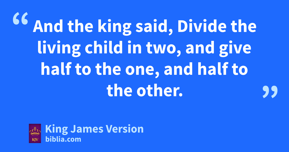 16 Then came there two women, that were harlots, unto the king, and kstood before him. 17 And the one woman said, O my lord, I and this woman dwell in one house; and I was delivered of a child with her in the house. 18 And it came to pass the third day after that I was delivered, that this woman was delivered also: and we were together; there was no stranger with us in the house, save we two in the house. 19 And this woman’s child died in the night; because she overlaid it. 20 And she arose at midnight, and took my son from beside me, while thine handmaid slept, and laid it in her bosom, and laid her dead child in my bosom. 21 And when I rose in the morning to give my child suck, behold, it was dead: but when I had considered it in the morning, behold, it was not my son, which I did bear. 22 And the other woman said, Nay; but the living is my son, and the dead is thy son. And this said, No; but the dead is thy son, and the living is my son. Thus they spake before the king. 23 Then said the king, The one saith, This is my son that liveth, and thy son is the dead: and the other saith, Nay; but thy son is the dead, and my son is the living. 24 And the king said, Bring me a sword. And they brought a sword before the king. 25 And the king said, Divide the living child in two, and give half to the one, and half to the other. 26 Then spake the woman whose the living child was unto the king, for her bowels †yearned upon her son, and she said, O my lord, give her the living child, and in no wise slay it. But the other said, Let it be neither mine nor thine, but divide it. 27 Then the king answered and said, Give her the living child, and in no wise slay it: she is the mother thereof. 28 And all Israel heard of the judgment which the king had judged; and they feared the king: for they saw that the lwisdom of God was †in him, to do judgment.