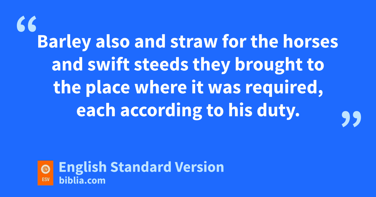 22 Solomon’s provision for one day was thirty cors3 of fine flour and sixty cors of meal, 23 ten fat oxen, and twenty pasture-fed cattle, a hundred sheep, besides deer, gazelles, roebucks, and fattened fowl. 24 For he had dominion over all the region west of the Euphrates4 from Tiphsah to vGaza, over all the kings west of the Euphrates. wAnd he had peace on all sides around him. 25 And Judah and Israel xlived in safety, yfrom Dan even to Beersheba, zevery man under his vine and under his fig tree, all the days of Solomon. 26 aSolomon also had 40,0005 stalls of horses for his chariots, and 12,000 horsemen. 27 And those officers supplied provisions for King Solomon, and for all who came to King Solomon’s table, each one in his month. They let nothing be lacking. 28 Barley also and straw for the horses and bswift steeds they brought to the place where it was required, each according to his duty.