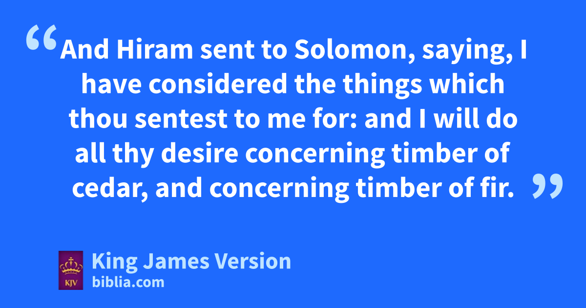 5 And ||Hiram king of aTyre sent his servants unto Solomon; for he had heard that they had anointed him king in the room of his father: bfor Hiram was ever a lover of David. 2 And cSolomon sent to Hiram, saying, 3 Thou knowest how that David my father could not build an house unto the name of the Lord his God dfor the wars which were about him on every side, until the Lord put them under the soles of his feet. 4 But now the Lord my God hath given me erest on every side, so that there is neither adversary nor evil foccurrent. 5 And, behold, I †purpose to build an house unto the name of the Lord my God, as the Lord spake unto David my father, saying, Thy son, whom I will set upon thy throne in thy room, ghe shall build an house unto my name. 6 Now therefore command thou that they hew me cedar trees out of Lebanon; and my servants shall be with thy servants: and unto thee will I give hire for thy servants according to all that thou shalt †appoint: for thou knowest that there is not among us any that can skill to hew timber like unto the hSidonians. 7 And it came to pass, when Hiram heard the words of Solomon, that he rejoiced greatly, and said, iBlessed be the Lord this day, which hath given unto David a wise son over this great people. 8 And Hiram sent to Solomon, saying, I have †considered the things which thou sentest to me for: and I will do all thy desire concerning timber of cedar, and concerning timber of jfir. 9 My servants shall bring them down from Lebanon unto the sea: and I will convey them by sea in floats unto the place that thou shalt †appoint me, and will cause them to be discharged there, and thou shalt receive them: and thou shalt accomplish my desire, kin giving food for my household. 10 So Hiram gave Solomon cedar trees and fir trees according to all his desire. 11 And Solomon gave Hiram twenty thousand †measures of wheat for food to his household, and ltwenty †measures of pure oil: thus gave Solomon to Hiram year by year. 12 And the Lord gave Solomon wisdom, mas he promised him: and there was peace between Hiram and Solomon; and they two made a league together.