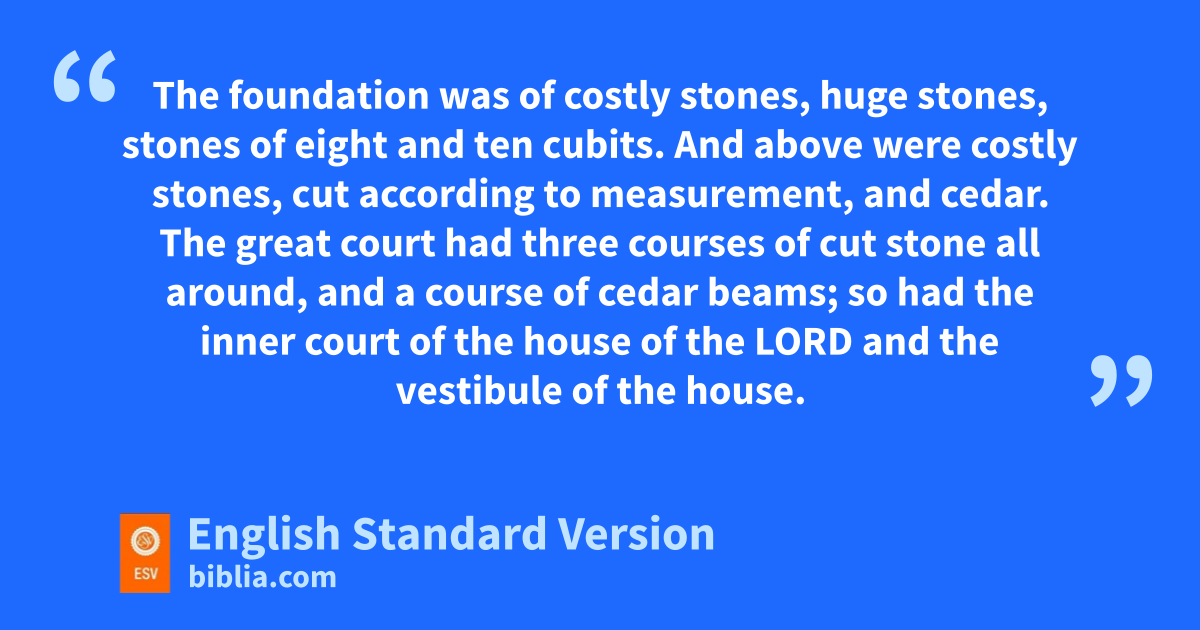 9 All these were made of costly stones, cut according to measure, sawed with saws, back and front, even from the foundation to the coping, and from the outside to the great court. 10 The foundation was of costly stones, huge stones, stones of eight and ten cubits. 11 And above were costly stones, cut according to measurement, and cedar. 12 dThe great court had three courses of cut stone all around, and a course of cedar beams; so had the inner court of the house of the Lord and ethe vestibule of the house.