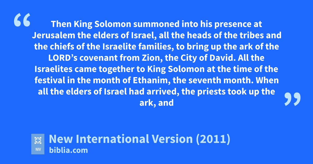 8 Then King Solomon summoned into his presence at Jerusalem the elders of Israel, all the heads of the tribes and the chiefso of the Israelite families, to bring up the arkp of the Lord’s covenant from Zion, the City of David.q 2 All the Israelites came together to King Solomon at the time of the festivalr in the month of Ethanim, the seventh month.s